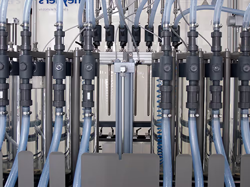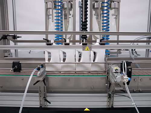 With its straightforward design, the Fluminis is well-suited for handling aggressive products like bleach. The cylinder volumes are adjustable, ranging from 1500ml to 5000 ml. The pneumatically driven beam, equipped with filling nozzles, follows the product level during filling, ensuring precise and consistent results.